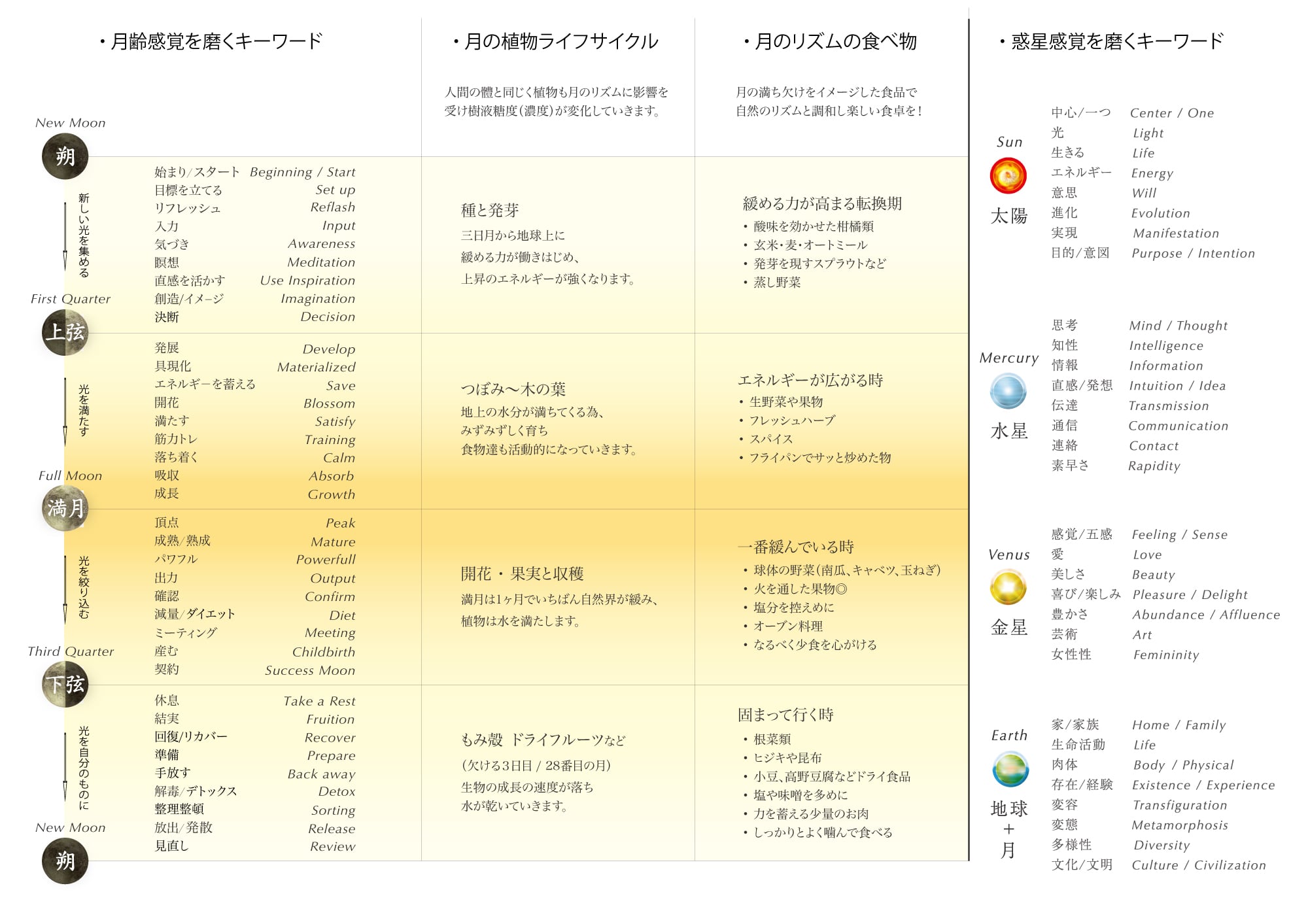 旧暦・月の満ち欠け・月齢・潮の満ち干き・流星群・月の遠近・二十四節気・雑節・内惑星の会合・巡行・逆行、惑星感覚を研くキーワード・月の植物ライフサイクル・月のリズムの食べ物・月の光を楽しむキーワードの付録など満載した、西暦・旧暦併記のハイブリッドカレンダー